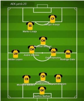 Απο το 65′ και μετά και ειδικά αν εχεις και ενα σκορ που σε ευνοεί,βγαζεις τον Μασουντ που μπορει να εχει κουραστει και πετάς τον Κονέ στο κέντρο,στον άξονα,εχοντας δίπλα του Σιμόες και Γαλανόπουλο,και μεταφέρεις τον Λιβάγια πιο πίσω σαν μεσο-επιθετικό,ακριβώς πίσω απο Αραούχο.