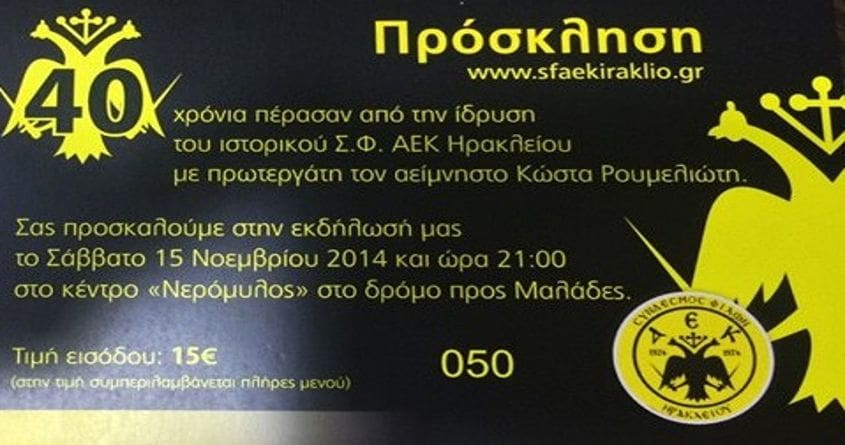 Τα 40 χρόνια από την ίδρυση του γιορτάζει το Σάββατο 15 Νοεμβρίου ο ιστορικός Σ.Φ. ΑΕΚ Ηρακλείου Κρήτης.