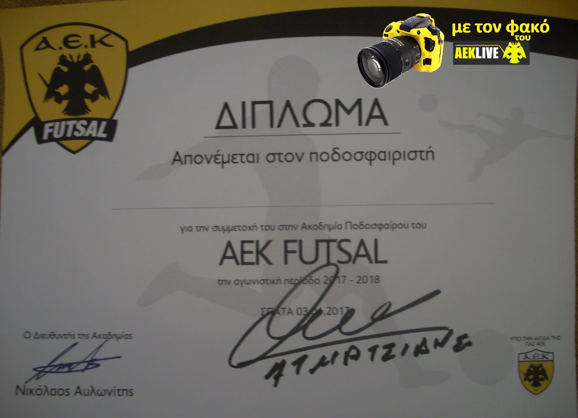 Στα Σπάτα βρέθηκε η ακαδημία futsal της ΑΕΚ για εσωτερικό τουρνουά και την παραλαβή των διπλωμάτων, για την περίοδο 2016-2017. Στο προπονητικό κέντρο υποδέχθηκαν τα μικρά αετόπουλα ο Ηλίας Ατματσίδης, ο Μιχάλης Βλάχος, ο Μιχάλης Παυλής και ο νέος υπεύθυνος των ακαδημιών, μαζί με τον Άκη Ζήκο, Γιάννης Σαμαράς.