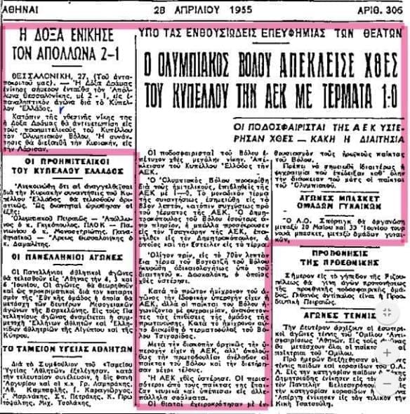 Η ΑΕΚ υποδεχόταν για τον θεσμό του Κυπέλλου, στη φάση των “16” τον Ολυμπιακού Βόλου. Η ομάδα της Μαγνησίας προερχόταν από έναν τρομακτικό σεισμό που έκανε άνω κάτω τον Βόλο στις 19 Απριλίου 1955.