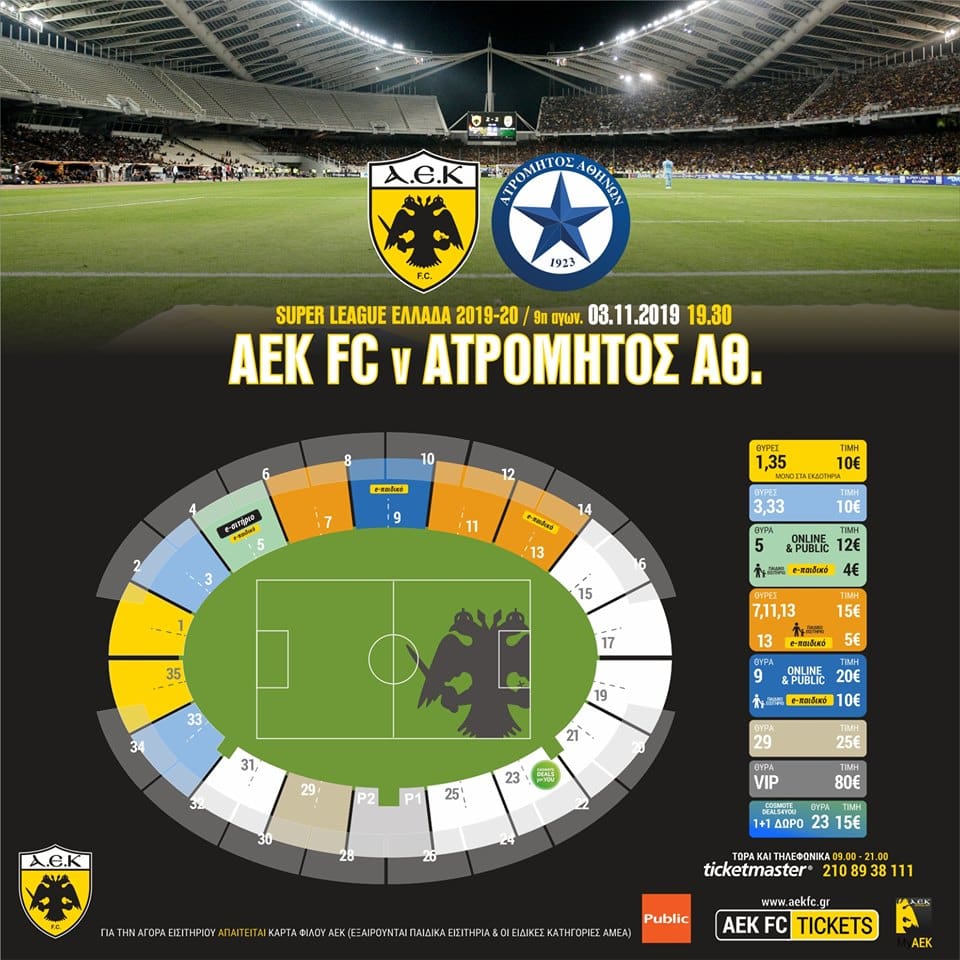 Η ανακοίνωση της ΠΑΕ ΑΕΚ: Σε λειτουργία βρίσκεται ήδη το ηλεκτρονικό εισιτήριο και οι πωλήσεις μέσω των καταστημάτων PUBLIC για τον αγώνα του πρωταθλήματος Super League...