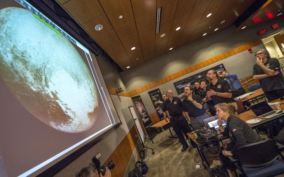 Με ενθουσιασμό αλλά και εμφανή αγωνία στα πρόσωπά τους, τα μέλη του διαστημικού προγράμματος «Νέοι Ορίζοντες» παρακολουθούν στη γιγαντοοθόνη τη χθεσινή διέλευση του ομώνυμου μη επανδρωμένου...