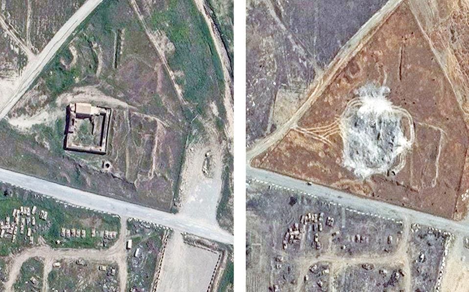 Μοναστήρι του 11ου αιώνα στη Μοσούλη, σε φωτογραφίες από δορυφόρο. Αριστερά όπως ήταν έως το 2014 και δεξιά όπως είναι σήμερα, μετά την ισοπέδωσή του από...