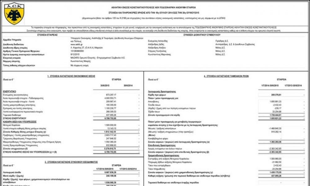 Κερδοφόρος -έστω και οριακά- ήταν ο πρώτος ισολογισμός της (νέας) ΠΑΕ ΑΕΚ, ο οποίος καταχωρήθηκε στις 21/12/2015 στο Γενικό Εμπορικό Μητρώο (Γ.Ε.ΜΗ) με Κωδικό Αριθμό Καταχώρισης...