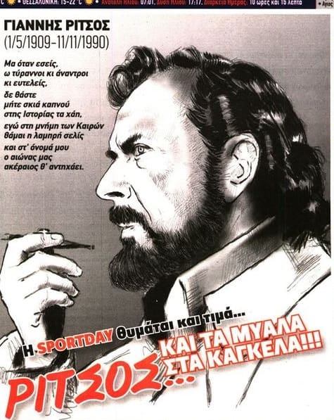 Δείτε το πραγματικά πρωτότυπο τρόπο επέλεξε η SportDay να κυκλοφορίσει το αποψινό της “φύλλο” στα 25 χρόνια από τον θάνατο του μεγάλου μας ποιητή Γιάννη Ρίτσου..