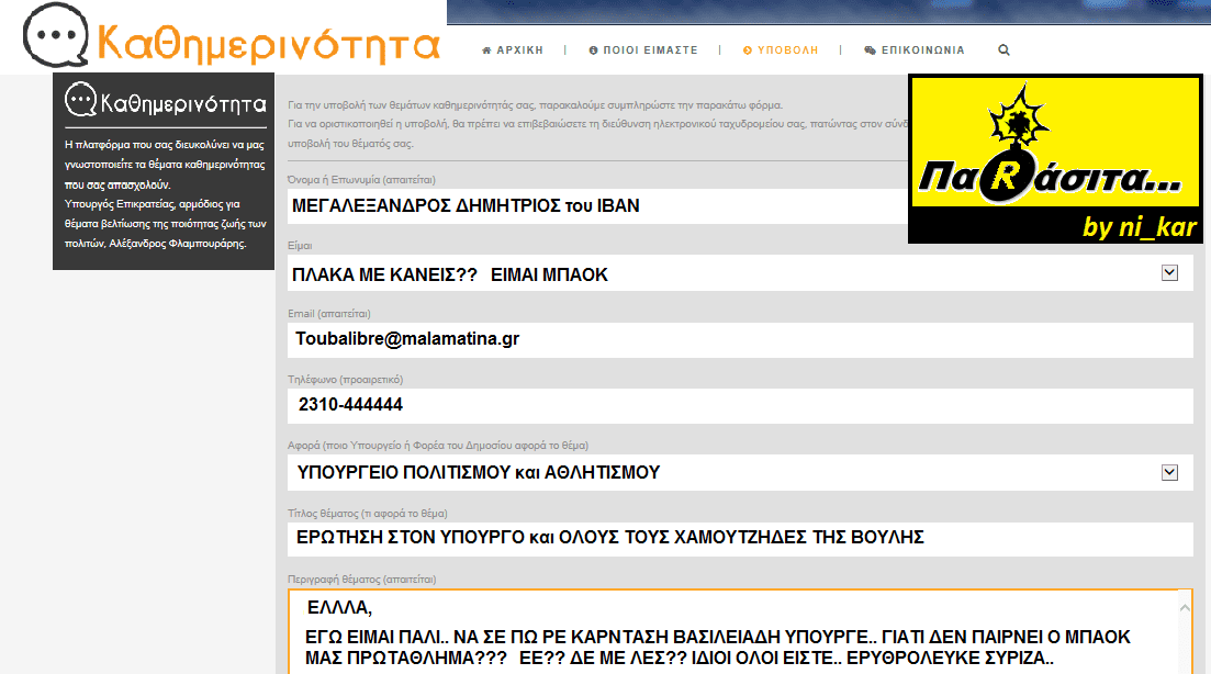 Ανέβηκε το σχετικό portal της κυβέρνησης και υποβλήθηκαν τα πρώτα θέματα καθημερινότητας που απασχολούν τον Πολἰτη. Τα ΠαRάσιτα σε αποκλειστικότητα σας παρουσιάζουν το πρώτο.. ni_kar...