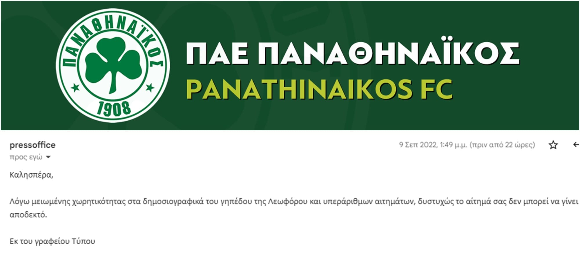 Στις 5 Σεπτεμβρίου ημέρα Δευτέρα στείλαμε αίτημα στο Γραφείο Τύπου της ΠΑΕ Παναθηναϊκός για τη διαπίστευση του Σωφρόνη Τιγκιρίδη με το AEK LIVE για τον αυριανό...