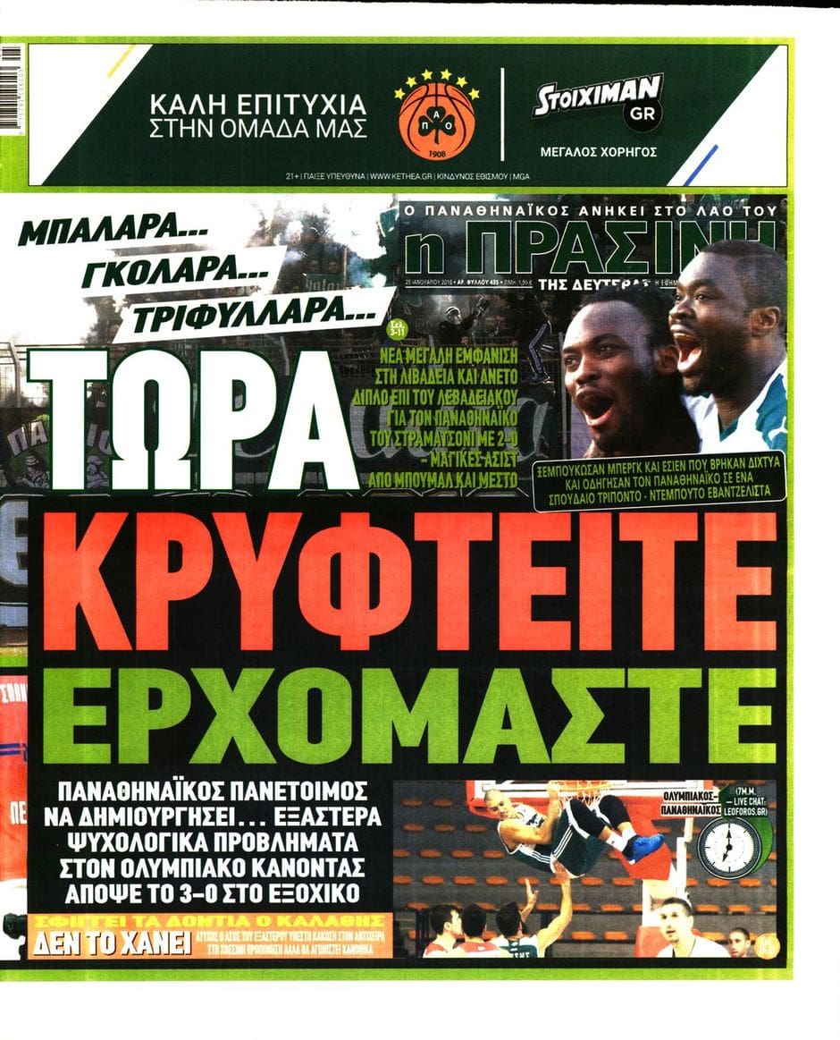 Είναι να γελάς. Το χθεσινό πρωτοσέλιδο της Πράσινης τιτλοφορήθηκε ως “Τώρα Κρυφτείτε, Ερχόμαστε”, συνδυάζοντας τη νίκη της βαζέλας στη Λιβαδειά και το ντέρμπι με τους γαύρους...