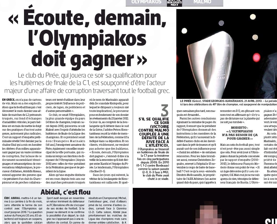 Μία φράση από την κατάθεση του Πέτρου Κωνσταντινέα που αναφέρει «Άκουσε αύριο ο Ολυμπιακός πρέπει να νικήσει» χρησιμοποιεί ως άξονά της η γαλλική εφημερίδα «l’ equipe»...
