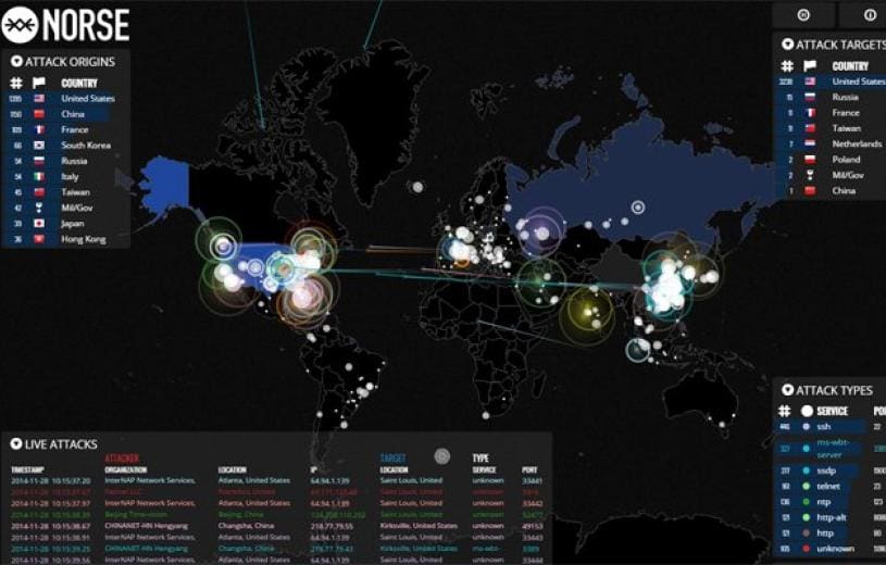 Δείτε σε πραγματικό χρόνο τις κυβερνοεπιθέσεις σε ολόκληρο τον πλανήτη σε ιστοσελίδα της NORSE. Πατήστε εδώ για να μπείτε στην εφορμογή. Επάνω αριστερά είναι η προέλευση...