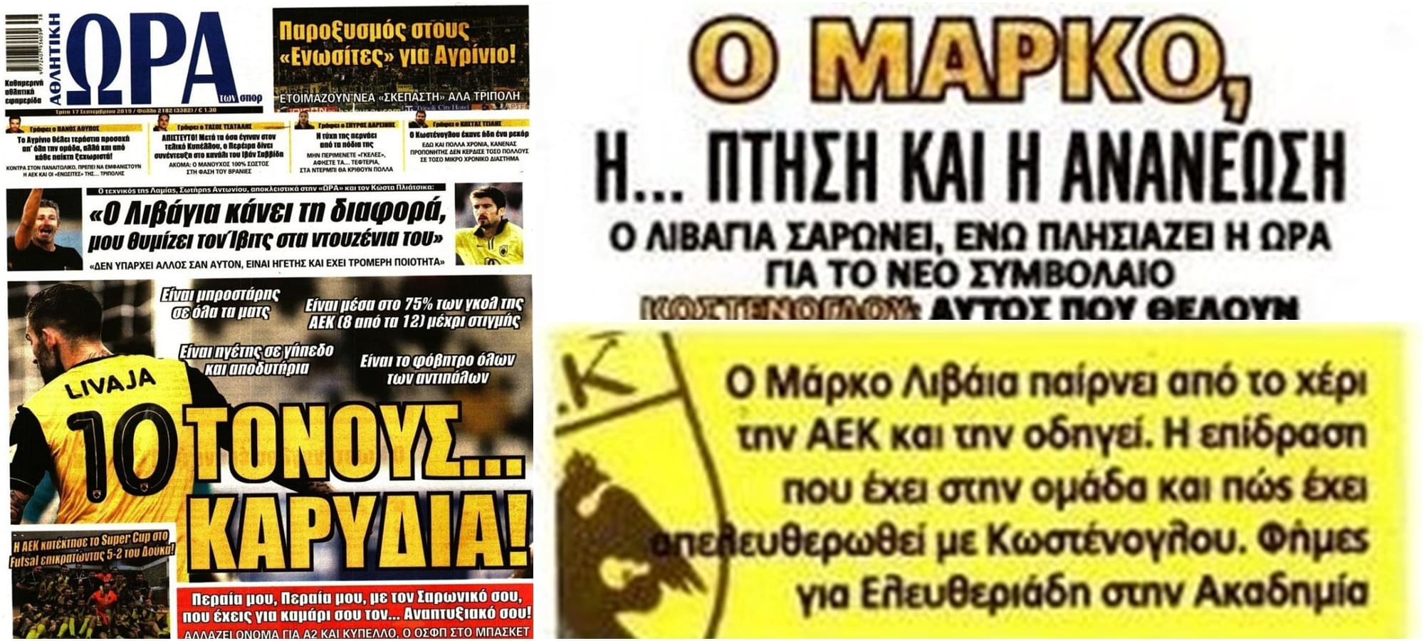 Διαβάστε ΜΟΝΟ τα κιτρινόμαυρα πρωτοσέλιδα χτυπήματα για την ΑΕΚ Σήμερα το μενού έχει ανάλυση για τον Μάρκο Λιβάγια και τους δικούς του κανόνες επιτυχίες, την αγωνία...