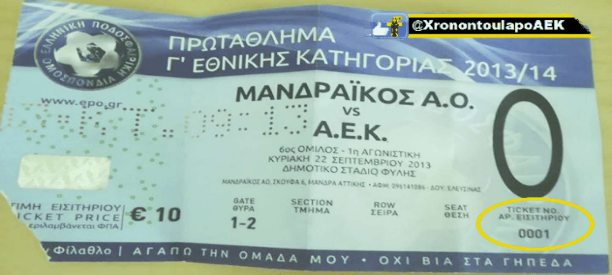 22-9-2013. Το πρώτο εισιτήριο στην πρώτη παρουσία της ΑΕΚ στη Γ΄Εθνικη. Ο Μανδραϊκός φιλοξένησε την ένωση, στο δημοτικό στάδιο της Φυλής, σε ένα επεισοδιακό παιχνίδι. Η...