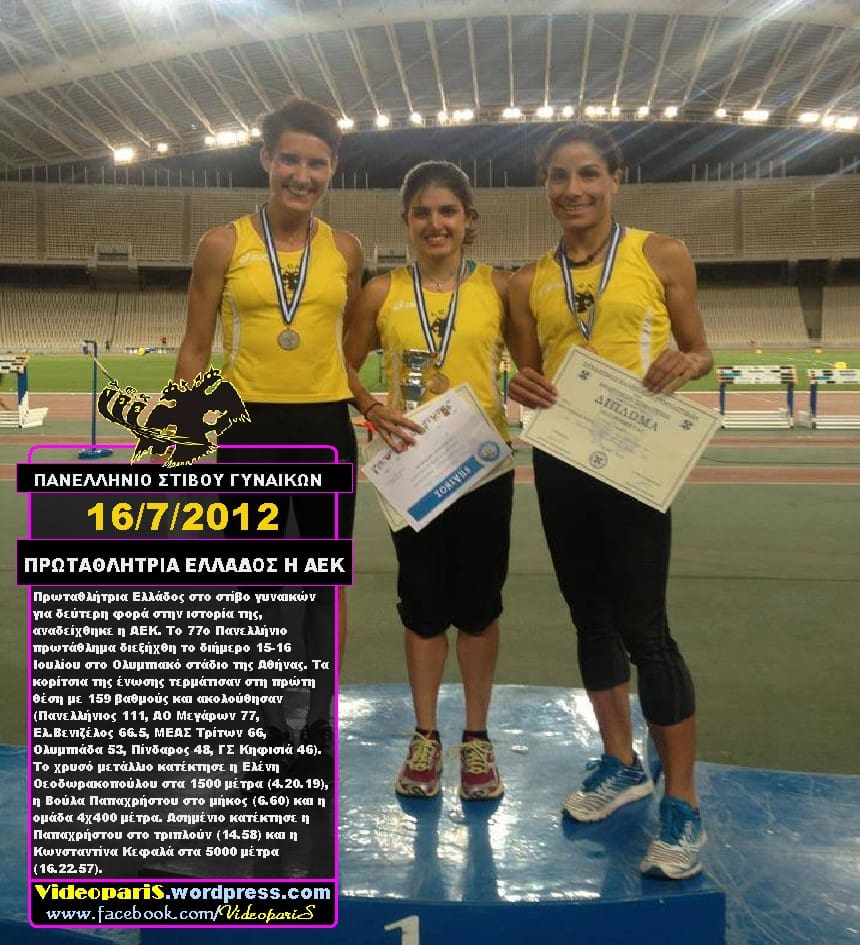 16-7-2012. Πρωταθλήτρια Ελλάδος στο στίβο γυναικών για δεύτερη φορά στην ιστορία της, αναδείχθηκε η ΑΕΚ. Το 77ο Πανελλήνιο πρωτάθλημα διεξήχθη το διήμερο 15-16 Ιουλίου στο Ολυμπιακό...