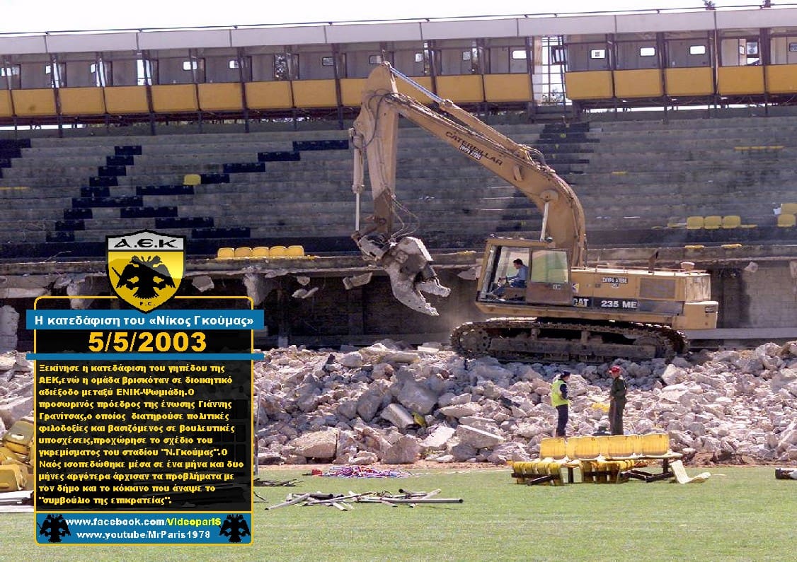 5-5-2003. Μετά τον τελευταίο αγώνα με τον Άρη,το “Ν.Γκούμας” παραδόθηκε στην κατασκευαστική εταιρία J&P ΑΒΑΞ,η οποία ανέλαβε και την κατεδάφιση του. Το ίδιο βράδυ έγινε και...
