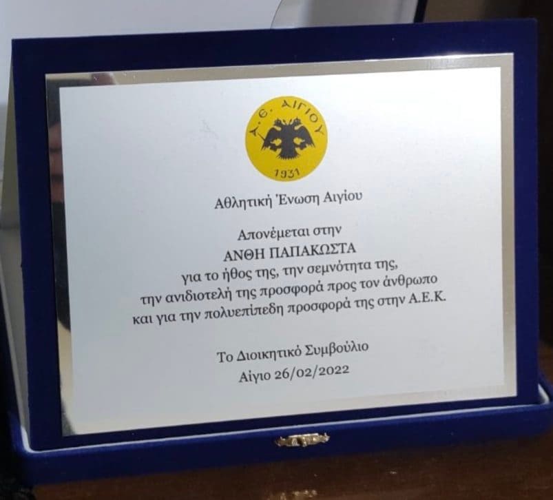 Η διοίκηση της Α.Ε. Αιγίου βράβευσε την Ανθή Παπακώστα για ήθος και τη σεμνότητα της, την ανιδιοτελή της προσφορά προς τον άνθρωπο και για την πολυεπίπεδη προσφορά της στην Α.Ε.Κ. Επίσης η Ανθή Παπακώστα βραβεύτηκε από τον Σύνδεσμο Φιλάθλων Α.Ε.Κ. Αιγιαλείας για την πολυετή προσφορά της στην Α.Ε.Κ.