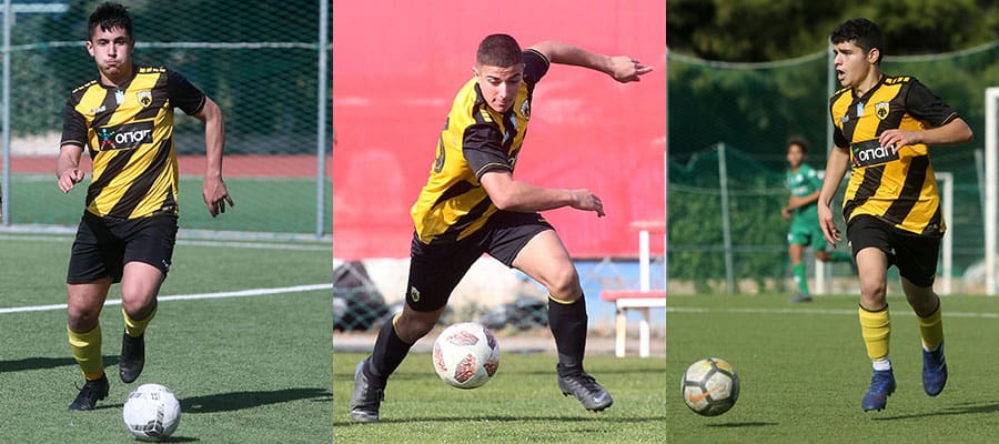 Οι ποδοσφαιριστές της ομάδας Κ15 της ΑΕΚ Σάββας Γιαματζίδης (αριστερά) Παναγιώτης Κοντάκης (στο μέσον) και Φίλιππος Σκιαδαρέσης (δεξιά) κλήθηκαν στην Εθνική Ομάδα Κ15 για προπονήσεις και φιλικό αγώνα στις εγκαταστάσεις της ΕΠΟ στον Αγιο Κοσμά στο διάστημα 9-11 Μαρτίου 2020