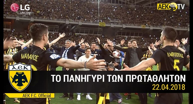 Η κάμερα του AEK TV ήταν παντού: στις στιγμές χαράς με τη λήξη του αγώνα μέσα στον αγωνιστικό χώρο, στον γύρο θριάμβου των… τρελαμένων πρωταθλητών, στο «όλε-όλε» που οργάνωσαν οι ίδιοι οι ποδοσφαιριστές από τη σέντρα, δίνοντας το σύνθημα σε εξήντα χιλιάδες κόσμο, και βέβαια μέσα στα αποδυτήρια όπου η έκσταση και η… παράνοια έφτασαν στο απόγειό τους.