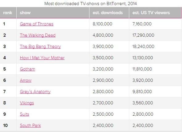 Η καθιερωμένη καταμέτρηση-ανασκόπηση της ιστοσελίδας Torrentfreak αποκαλύπτει ότι η τρέλα με το Game of Thrones παραμένει άσβεστη για εκατομμύρια τηλεθεατές, καθώς για τρίτη σερί χρονιά βρίσκεται στην πρώτη θέση των πιο πειρατικά κατεβασμένων τηλεοπτικών σειρών αφήνοντας στη δεύτερη θέση το The Walking Dead και στην τρίτη θέση το The Big Bang Theory..