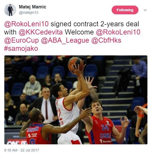 Επιστροφή σε γνώριμα μέρη για τον Ρόκο Λένι Ούκιτς ο οποίος μετά την πολύ καλή χρονιά που έκανε στη “Βασίλισσα” αποφάσισε να γυρίσει στην πατρίδα του και την Τσεντεβίτα.Τη μεταγραφή ανακοίνωσε, μέσω twitter, o Ματέι Μάμιτς, αθλητικός διευθυντής της ομάδας με τον πολύπειρο γκαρντ να επιστρέφει στην ομάδα που αγωνιστηκε όταν έφυγε από τον Παναθηναϊκό, το 2014. Στην πατρίδα του, ο Ούκιτς, συναντά εκ νέου τον Γιούρι Ζντοβτς.