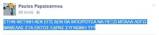 ΚΑΡΦΙΑΓιατί δεν θα μπορούσε να παίξει ο Παπαϊωάννου στην σημερινή ΑΕΚ… Published 9 έτη agoon 1 Νοεμβρίου 2016By Νικόλας Αγγελίδης Views 324Γράφει στο προσωπικό του προφίλ στο Facebook ο Παύλος Παπαϊωάννου… ΣΤΗΝ ΦΕΤΙΝΗ ΑΕΚ ΕΓΏ ΔΕΝ ΘΑ ΜΠΟΡΟΥΣΑ ΝΑ ΠΕΞΩ ΜΠΑΛΑ ΛΟΓΩ ΦΑΝΕΛΑΣ ΣΤΑ ΕΚΤΟΣ ΕΔΡΑΣ ΣΥΓΝΩΜΗ ??? Related Topics: Up NextΟ Κούγιας διδάσκει ποδοσφαιρικό προγραμματισμό Don't MissΗ επική ατάκα της ORIGINAL Πάτρας για το γήπεδο Νικόλας ΑγγελίδηςΜε ρίζα από την Πόλη και παππού αθλητή της πρώτης ομάδας βόλεϊ της ΑΕΚ δεν θα μπορούσα παρά να είμαι παράφορα ερωτευμένος μαζί της Continue Reading Advertisement You may like