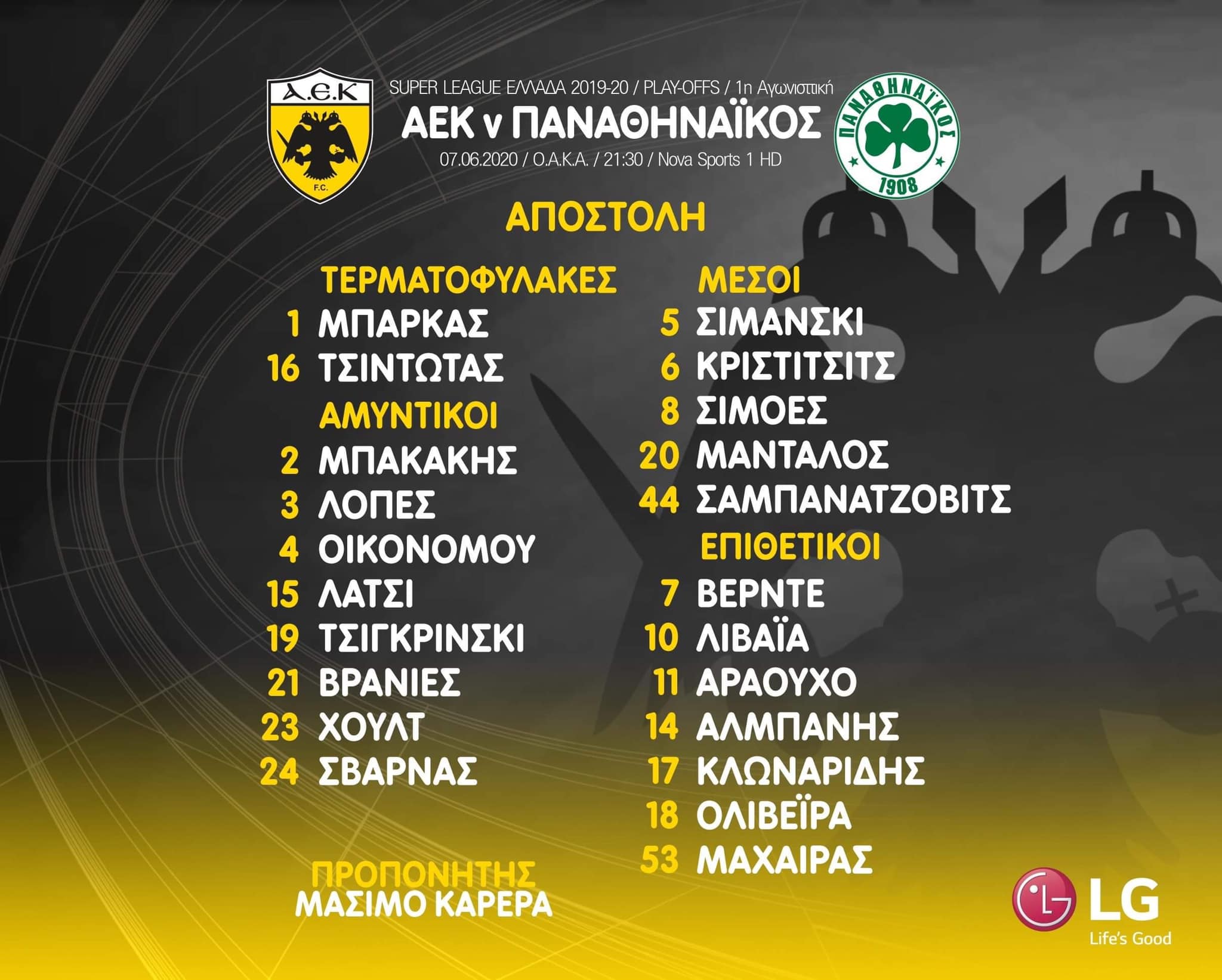 Έπειτα από το τέλος του προγράμματος, ο Μάσιμο Καρέρα ανακοίνωσε τις επιλογές του για την αποστολή του αυριανού (21.30) αγώνα με τον Παναθηναϊκό, στο ΟΑΚΑ, στο πλαίσιο της 1ης αγωνιστικής των Play-Offs.