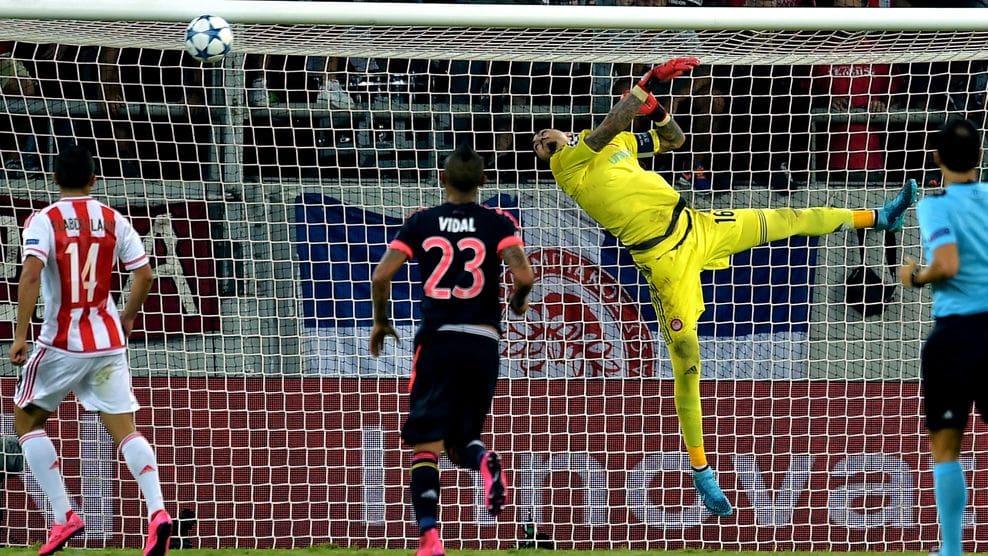 Olympiacos’ Spanish goalkeeper Roberto looks the ball going to the net during their UEFA Champions League football match, Group F, between Olympiakos and Bayern Munich at the Karaiskaki stadium in Piraeus, near Athens on September 16, 2015. AFP PHOTO / ARIS MESSINIS (Photo credit should read ARIS MESSINIS/AFP/Getty Images)