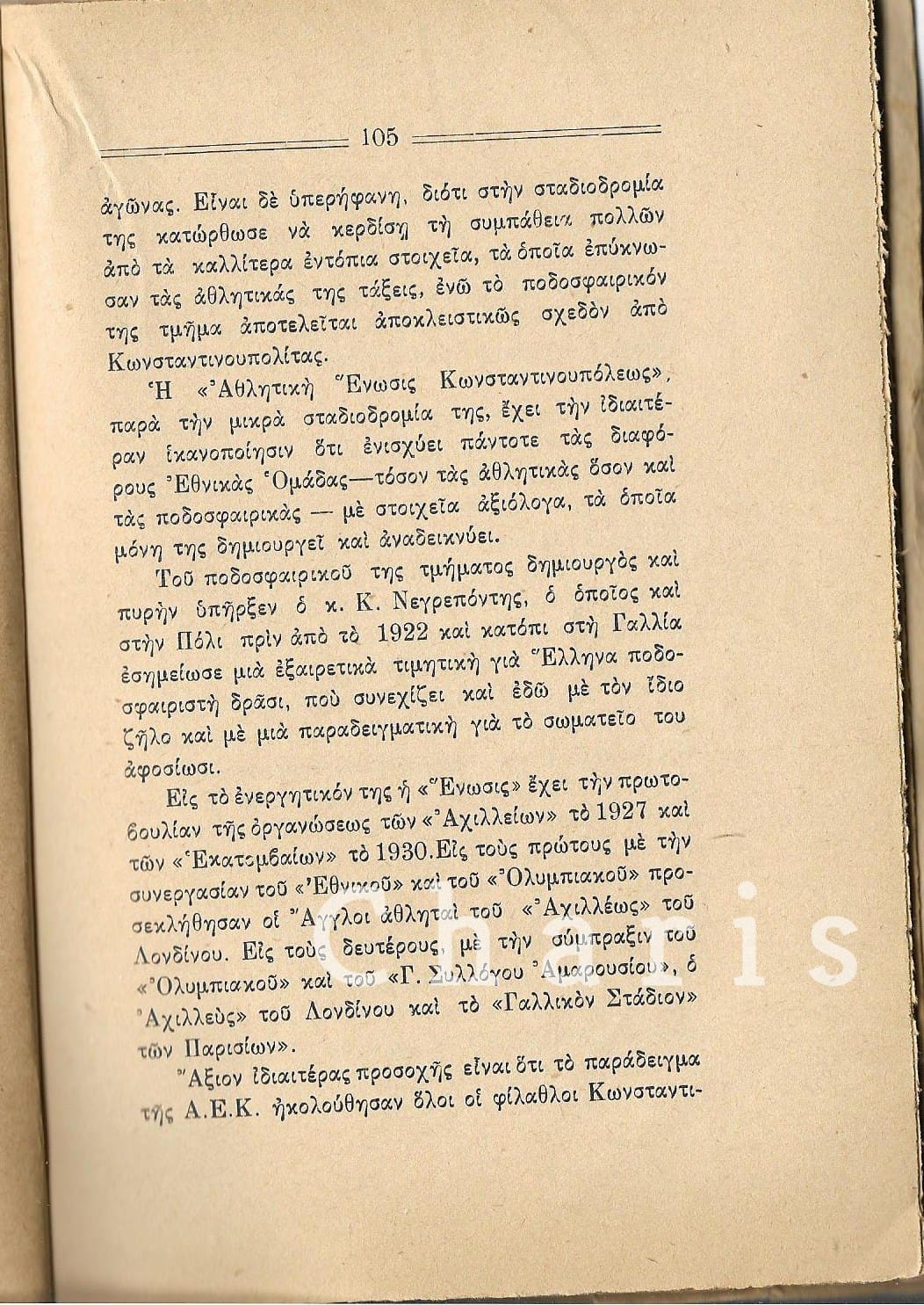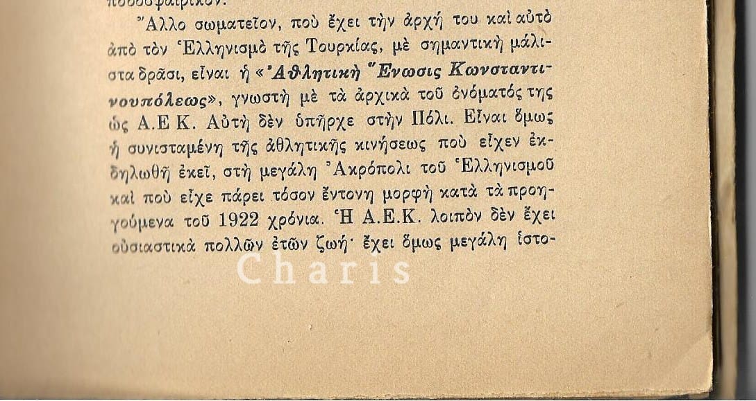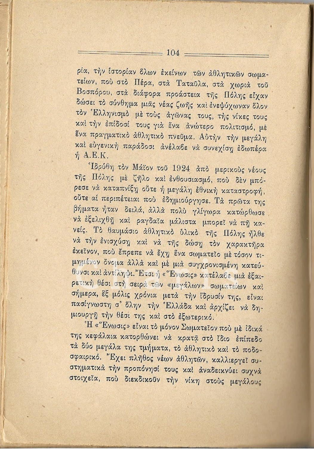 “Αυτή δεν υπήρχε στην Πόλι. Είναι όμως η συνισταμένη της αθλητικής κινήσεως που είχεν εκδηλωθεί εκεί […] κατά τα προηγούμενα του 1922 χρόνια” γράφει χαρακτηριστικά η Αθηνά και συμπληρώνει “έχει […] την ιστορίαν όλων εκείνων των αθλητικών σωματείων […] στο Πέρα, στα Ταταύλα, στα χωριά του Βοσπόρου, στα διάφορα προάστεια της Πόλης”.