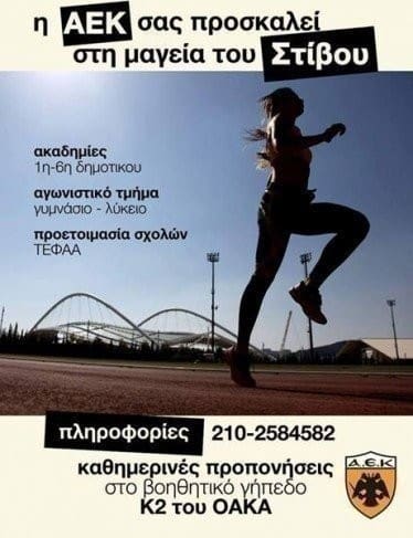 «Ελάτε να ζήσουμε την μαγεία του κλασικού αθλητισμού στις ακαδημίες στίβου της ΑΕΚ, υπό την καθοδήγηση των καταξιωμένων και έμπειρων προπονητών μας. Για περισσότερες πληροφορίες στο τηλέφωνο 210-2584582».