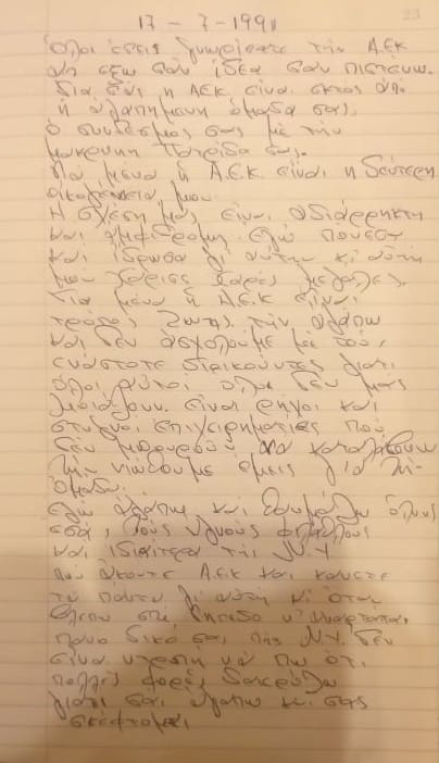 Μια χειρόγραφη επιστολή του Παγκόσμιου Γιώργου Αμερικάνου στις 17 Ιουλίου του 1991 αφιερωμένη στα παιδιά του ηρωικού Συνδέσμου Οπαδών ΑΕΚ Νέας Υόρκης. Να θυμίσουμε ότι ο Αμερικάνος είχε πατήσει Αμερική στις αρχές της δεκαετίας του ’90 σε μια μοναδική εκδήλωση τιμής που διοργάνωσαν προς τιμή του οι ξενιτεμένοι Ενωσίτες… Ιστορία…