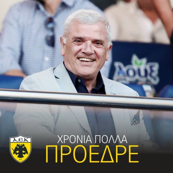 Αναλυτικά η ανακοίνωση:«Ο Σύνδεσμος Παλαιμάχων Ποδοσφαιριστών της ΑΕΚ εύχεται στον Δημήτρη Μελισσανίδη επί τη ευκαιρία της ονομαστικής του εορτής υγεία, ευτυχία και μακροημέρευση. Να συνεχίσει να οδηγεί την αγαπημένη μας ομάδα σε πρόοδο και επιτυχίες και να δει σύντομα να γίνεται πραγματικότητα το όνειρό του και όνειρο όλων μας να επιστρέφει η ΑΕΚ στο σπίτι της στη Νέα Φιλαδέλφεια».