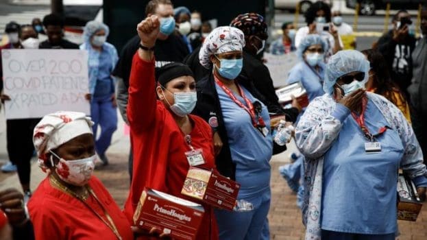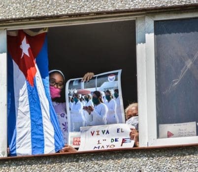 epa08395375 A residents raises his fist in salute from his window next to a sign reading in Spanish: ‘May First. Jobs and Public Services’ in Valladolid, Spain, 01 May 2020. The first day of May is celebrated worldwide as International Workers’ Day, which marks the 1886 Haymarket labor strike and subsequent riots in Chicago, Illinois, USA. This year, May Day takes place amid the global pandemic of the COVID-19 disease caused by the SARS-CoV-2 coronavirus. EPA/NACHO GALLEGO