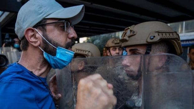epa08395624 Anti-government protesters wave the national flag during a demonstration to mark International Workers’ Day (Labor Day) in Beirut, Lebanon, 01 May 2020, during the coronavirus disease (COVID-19) pandemic. Lebanese protesters marked Labor Day with demontrations amid growing economic hardship againt reform plans of the government announced by Prime Minister Hassan Diab on 30 April. EPA/NABIL MOUNZER