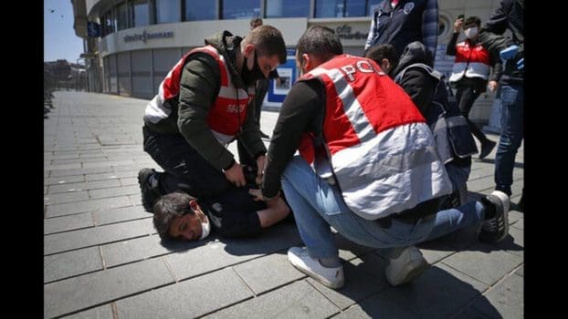 Turkish police officers, wearing face masks to protect against coronavirus, stand behind carnations from a wreath damaged during a scuffle with demonstrators during May Day protests in Istanbul, Friday, May 1, 2020. Police in Istanbul detained at least 15 people including trade union leaders who tried to stage a May Day march in defiance of a coronavirus lockdown and a ban on demonstrations at the historic Taksim Square. In 1977, 34 people were killed there during a May Day event when shots were fired into the crowd from a nearby building. (AP Photo/Emrah Gurel)