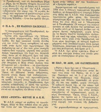 Το ημερολόγιο δείχνει Ιούνιος του 1958… Το μηνιαίο αθλητικό περιοδικό “Τα Σπορ” κάνει αφιέρωμα στο πρωτάθλημα ποδοσφαίρου και αναφέρεται χαρακτηριστικά στη ρέντα… της ΑΕΚ!