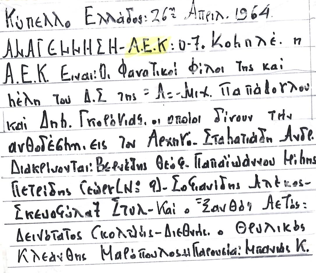 1964 η ΑΕΚ φιλοξενήθηκε από την Αναγέννηση Άρτας στο πλαίσιο του Κυπέλλου Ελλάδας μπροστά σε 17.000 θεατές που στοιβάχτηκαν στο λόγο για να δουν την Πρωταθλήτρια ΑΕΚ! Η ΑΕΚ πέτυχε τότε άνετη νίκη με 7-0! Δείτε τις συνθέσεις των δυο ομάδων όπως τις έχει καταγράψει ιδιόχειρα – στο αρχείο του – ο Κώστας Μπανιάς.