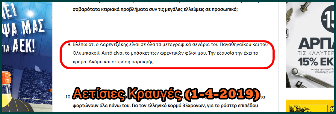 - Ακόμα και ο Λαρεντζάκης που μεγαλώνοντας κατάφερε να είναι μια 27χρονη μετριάντζα, αποφάσισε ότι δεν το χωράει η ΑΕΚ και πήγε να δώσει μάχη με τον Κόνιαρη για το ποιος θα είναι 5ο γκαρντ. Γκρεμίζοντας τις αυταπάτες ότι θα μπεις σφήνα με σχέδια και οράματα.