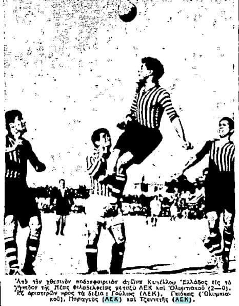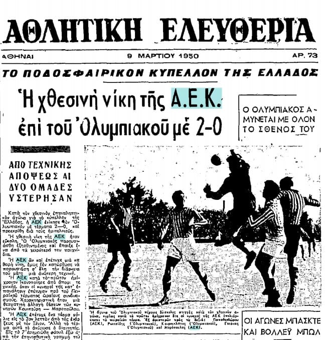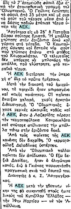 Και πιο κάτω σημειώνεται: Από τους παίκτες της ΑΕΚ κανένας δεν διακρήθηκε! Ο τερματοφύλακας Δελαβίνιας υστέρησε… Δηλαδή η ομάδα που κέρδισε με 2-0 δεν είχε κανέναν διακριθέντα. Ούτε τους σκόρερς της Ξένο και Κουντούρη!