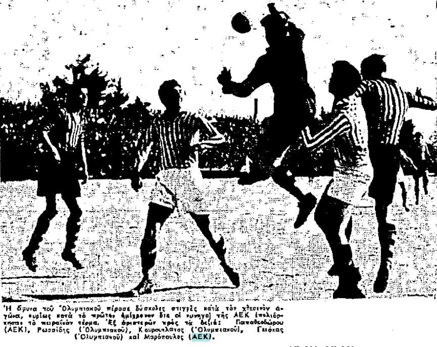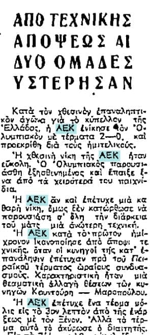 Ενώ η Ένωση έχει πατήσει τον Ολυμπιακό, το ρεπορτάζ μιλάει για αγωνιστική ανεπάρκεια ΚΑΙ των δυο ομάδων. Και σημειώνει “Η ΑΕΚ αν και επέτυχε μια καθαρή νίκη, δεν κατόρθωσε να παρουσιάσει σε όλη τη διάρκεια του ματς μια ανώτερη τεχνική”.