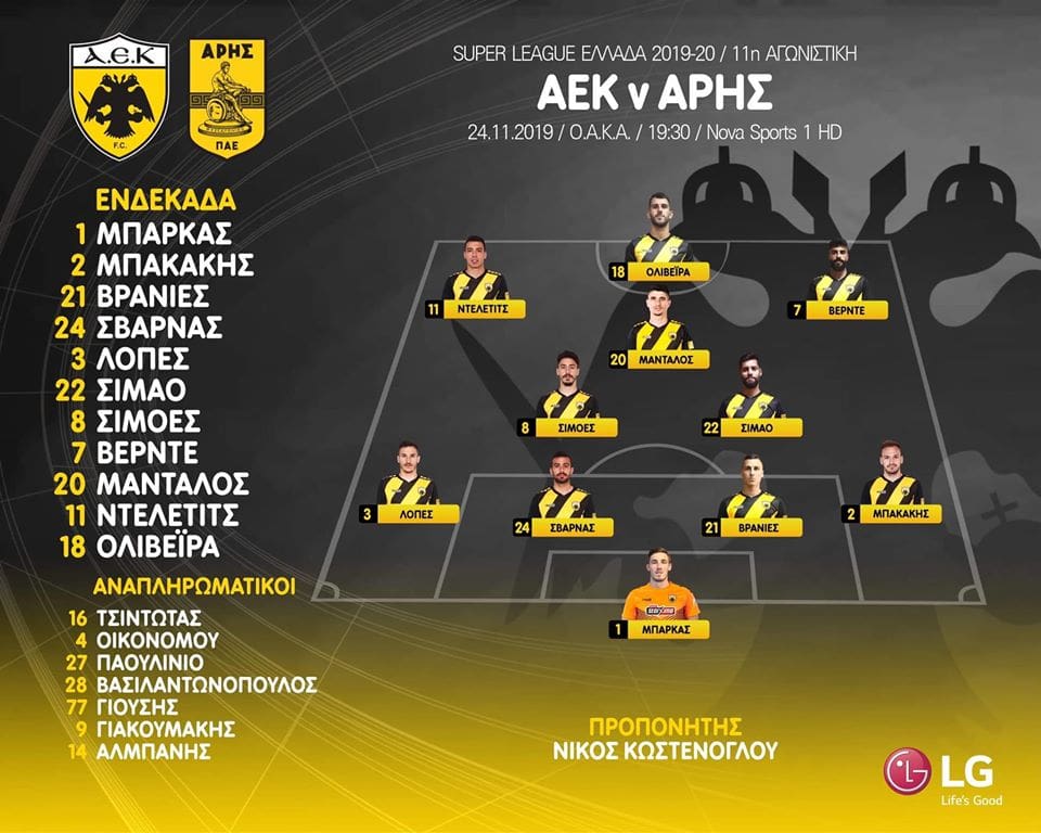 Ο Νταβίντ Σιμάο παίζει πλάι στον Αντρέ Σιμόες στο κέντρο, ενώ ο Μίλος Ντέλετιτς ξεκινάει στα αριστερά της ενδεκάδας της ΑΕΚ απέναντι στον Άρη.