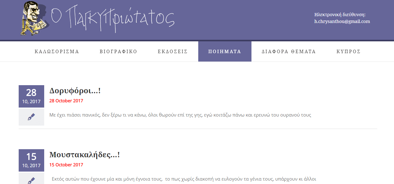 ΔΙΑΦΟΡΑΟ Δορυφόροι… του Παγκυπριώτατου Published 8 έτη agoon 28 Οκτωβρίου 2017By Νικόλας Αγγελίδης Views 381Με έχει πιάσει πανικός, δεν ξέρω τι να κάνω, όλοι θωρούν επί της γης, εγώ κοιτάζω πάνω και ερευνώ του ουρανού τους αχανείς του χώρους που έχει παραφορτωθεί από τους δορυφόρους!Η συνέχεια εδώ… Related Topics: Up NextΟ φόβος των δοκαριών (vid) Don't MissΗ ιστορία που δεν έγραψαν οι νικητές Νικόλας ΑγγελίδηςΜε ρίζα από την Πόλη και παππού αθλητή της πρώτης ομάδας βόλεϊ της ΑΕΚ δεν θα μπορούσα παρά να είμαι παράφορα ερωτευμένος μαζί της Continue Reading Advertisement You may like