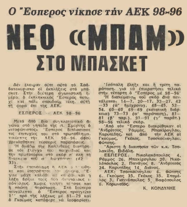 Από το παρελθόν της ΑΕΚ. Μάχη με τον Έσπερο στην Καλλιθέα και ήττα σε χιτσκοκικό ματς παρά τους 70 πόντους (!!!) που είχαν πετύχει δυο παίκτες μας… Ο Μηνάς Γκέκος και ο Βασίλης Γκούμας…