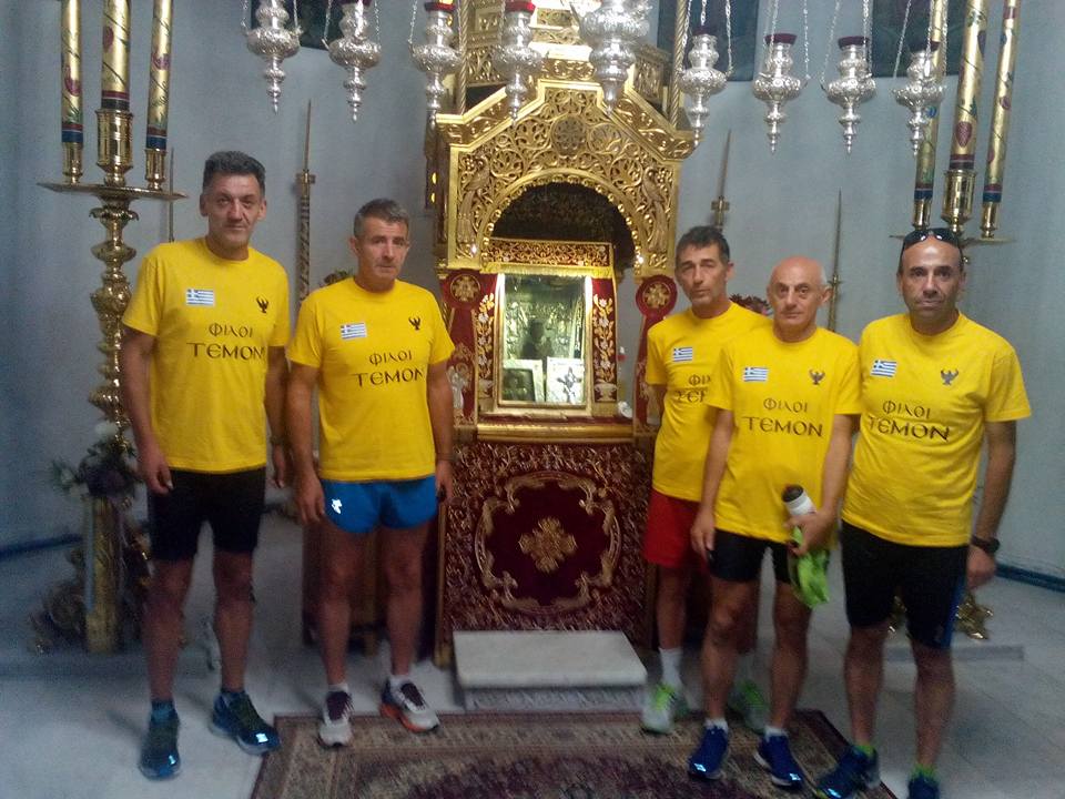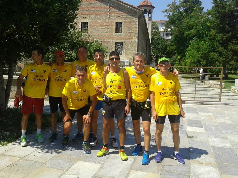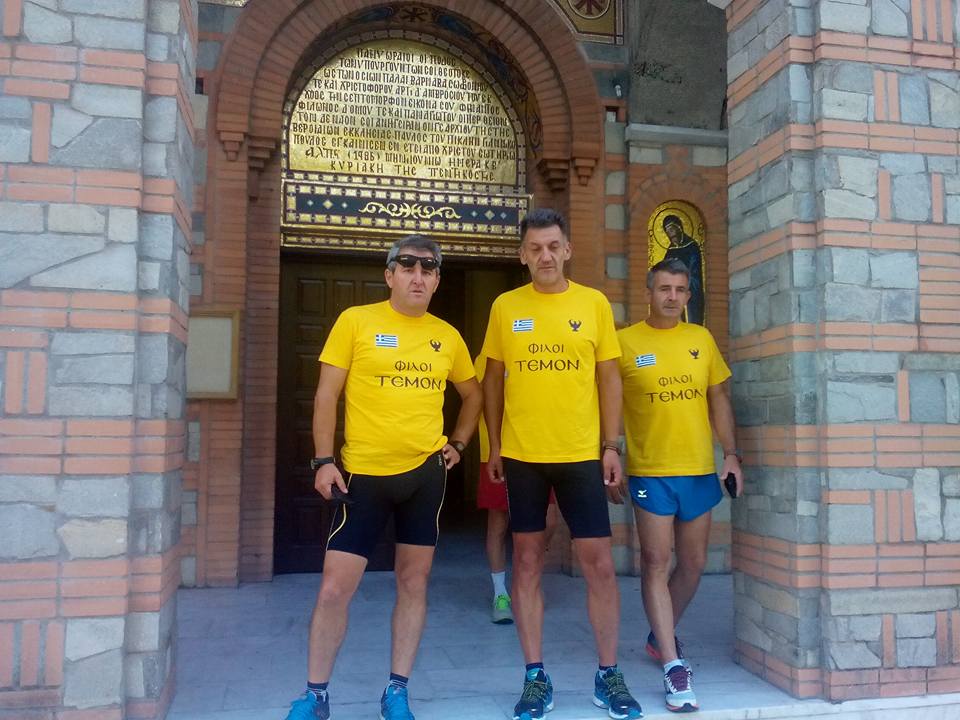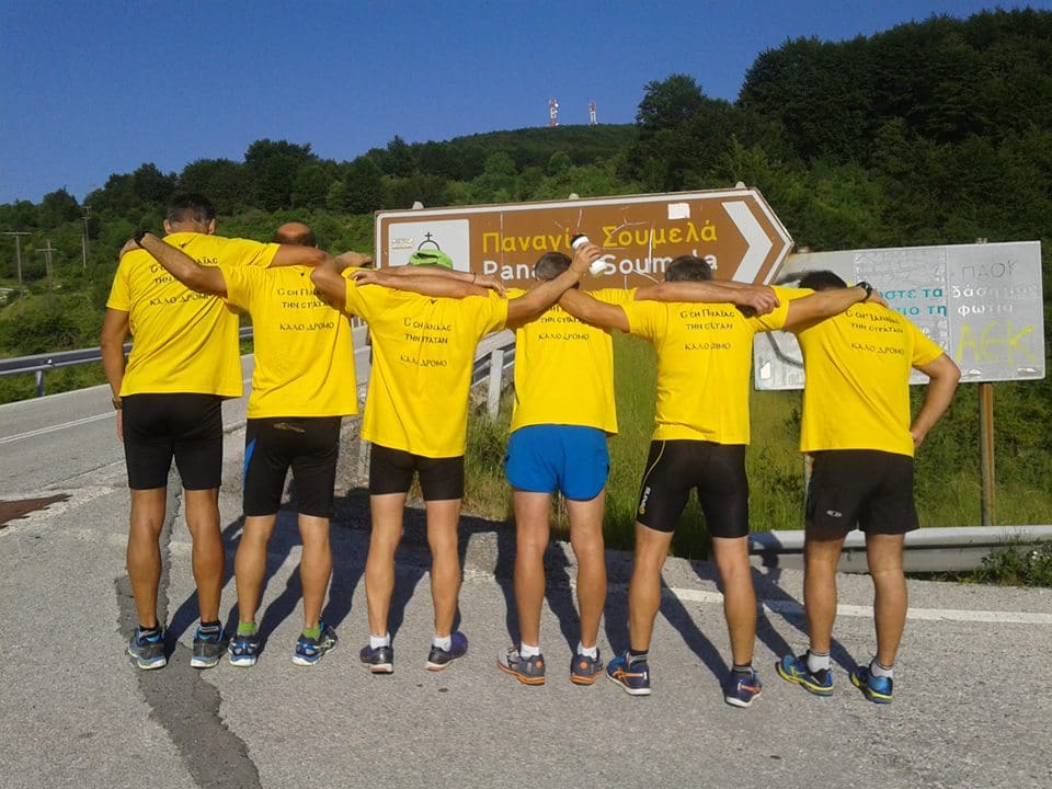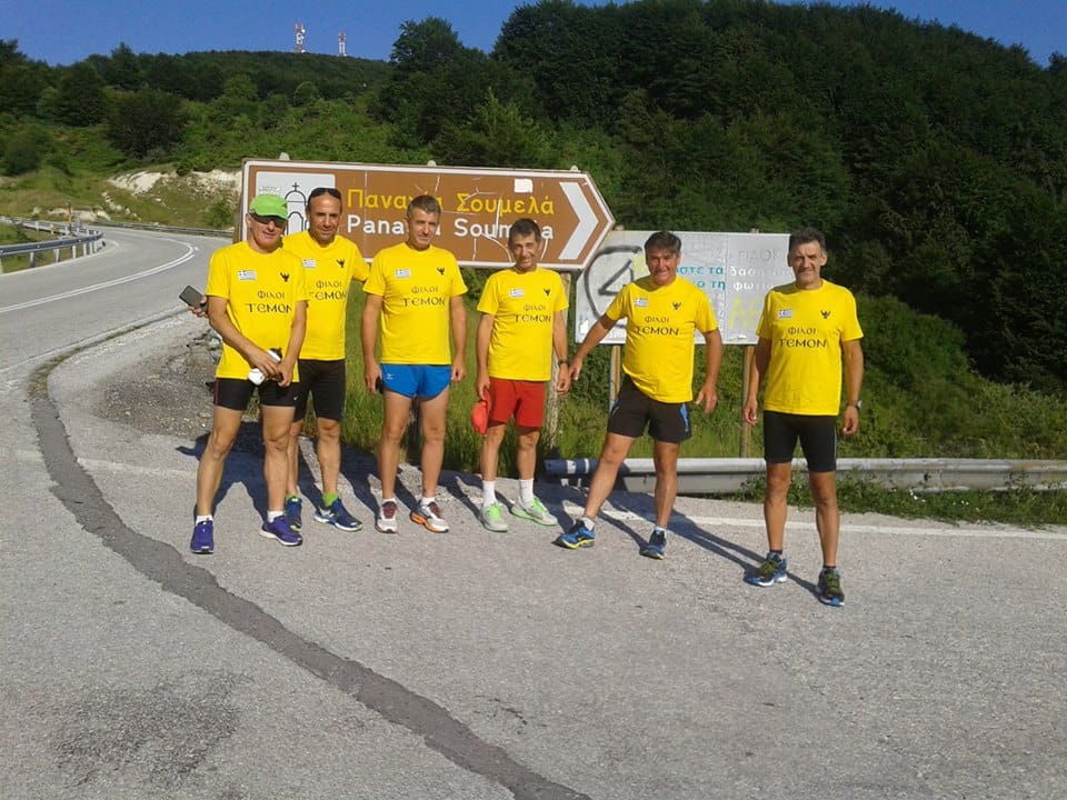 Το ταξίδι του Γιώργου ξεκίνησε απ’το χωριό του, την Άρδασσα. Μαζί του έτρεξαν μέχρι το μοναστήρι της Σουμελάς στην Καστανιά Ημαθίας ο Σύλλογος Δρομέων Οδοιπόρων Πτολεμαΐδας. Εφτά δρομείς απ’το Καϊλάρι (παλιό όνομα της Πτολεμαΐδας) έφτιαξαν κίτρινα T-shirts τα οποία έγραφαν μπροστά, “Φίλοι ΤΕΜΟΝ”.