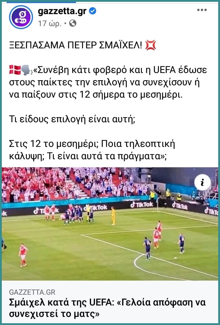 Με απόλυτο σεβασμό στις αντιδράσεις των ποδοσφαιριστών της Δανίας την ώρα που ο Έρικσον έδινε μάχη για τη ζωή του, θα ήθελα να πω ότι δεν αντέδρασαν ανάλογα όταν η τάνα η UEFA, τους έβγαλε μετά να πάνε να παίξουν μην και χαθεί κανά ευρώ.