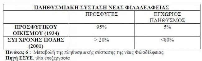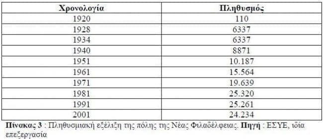 Οι πίνακες που ακολουθούν αφορούν την πληθυσμιακή σύνθεση του προσφυγικού συνοικισμού και της σύγχρονης πόλης, τις απογραφές που έλαβαν χώρα στη Ν. Φιλαδέλφεια έως το 2001 και τον επαγγελματικό προσανατολισμό των κατοίκων του προσφυγικού συνοικισμού.