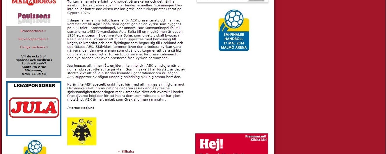Στην ιστοσελίδα της σημερινής αντιπάλου της ΑΕΚ Λούγκι φιλοξενείται αφιέρωμα για την Ένωση. Ο συγγραφέας Marcus Haglund παρουσιάζει στοιχεία για την ιστορία της ΑΕΚ.