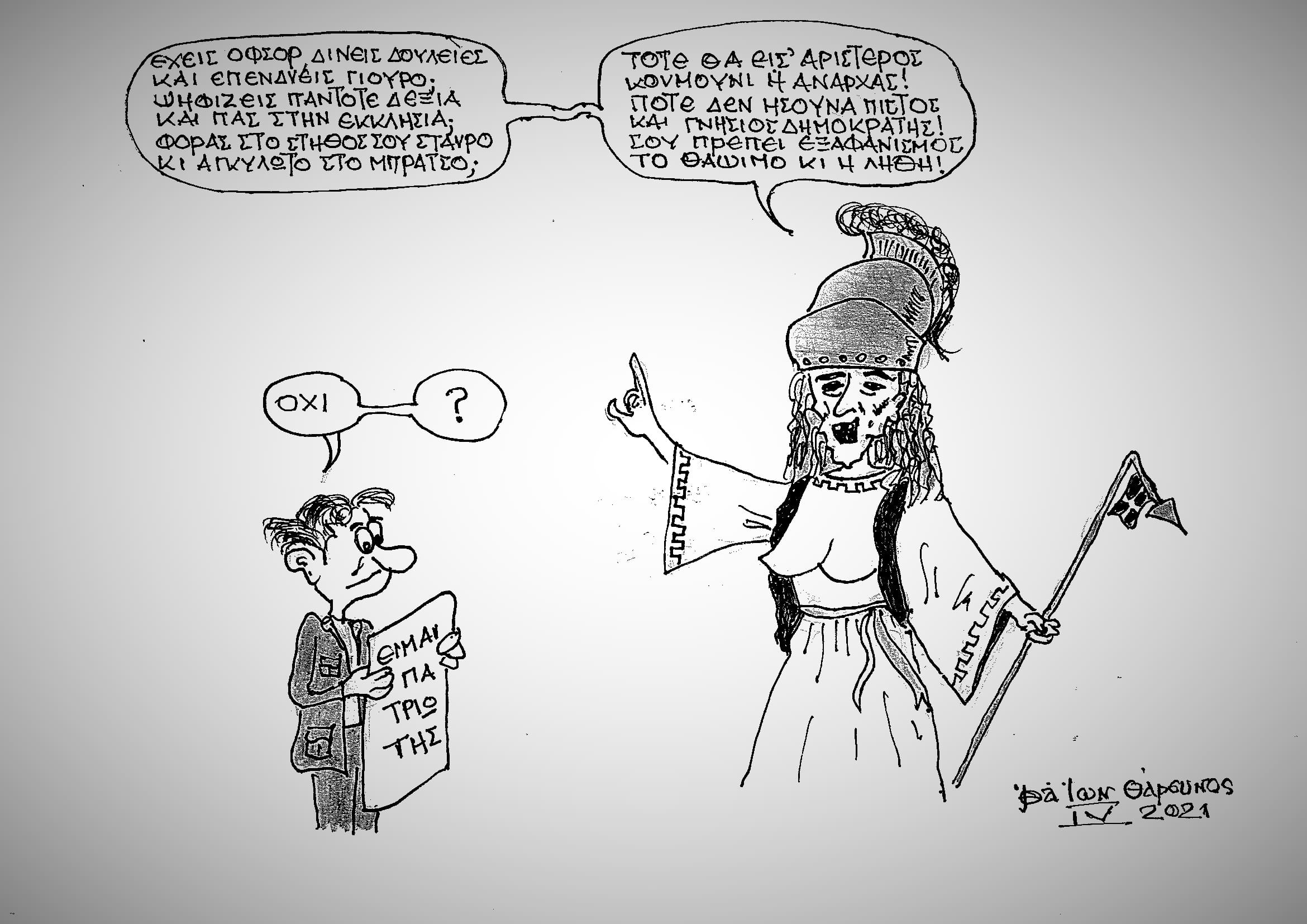 Παραβλέπουν όλοι αυτοί οι «κύριοι» ότι, μόνο ο απλός λαός δικαιούται τον τίτλο του πατριώτη να φέρει. Ο αγρότης, ο εργάτης, ο υπάλληλος, ο μικρομεσαίος, ο μικροαστός, όσοι τέλος πάντων καθημερινά για τον επιούσιο εργάζονται και μοχθούν. Γιατί τα υπάρχοντά τους ούτε σε τίποτε χρηματιστήρια παίζουν μήτε για κάποιο μεγαλύτερο κέρδος μεταναστεύουν. Στην Πατρίδα μένουν, αφού για ένα διαμερισματάκι, μερικές πεζούλες γης, ένα αυτοκίνητο και άντε ένα μικρό χρηματικό κομπόδεμα πρόκειται. Και εφόσον στον τόπο που ο κάτοχος γεννήθηκε και μεγάλωσε τα υπάρχοντα ανήκουν, αυτά ο ίδιος νιώθει την υποχρέωση να υπερασπιστεί και στα παιδιά του ατόφια να κληροδοτήσει. Μαζί με όσους την ίδια γλώσσα μιλάει, τα ίδια ήθη και έθιμα έχει, τις ίδιες αντιλήψεις μοιράζεται. Αληθινές ή ακόμη και λαθεμένες…