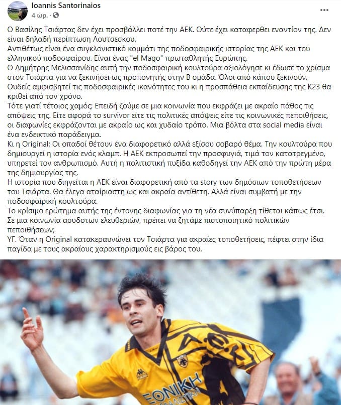 Σε μια αθλητική ομάδα, σε τέτοιες ηλικίες το σημαντικότερο είναι τα μηνύματα που περνάς στα νέα παιδιά για να μπορούν να συνδυάσουν το αρχαίο ρητό “νους υγιής εν σώματι υγιεί”. Τι μηνύματα κοινωνικού περιεχομένου περιμένουν στην ΑΕΚ από τον συγκεκριμένο κύριο, ο οποίος έχει εκφράσει τις μισσαλόδοξες απόψεις του κατά καιρούς, με απύθμενο μίσος για συνανθρώπους μας;