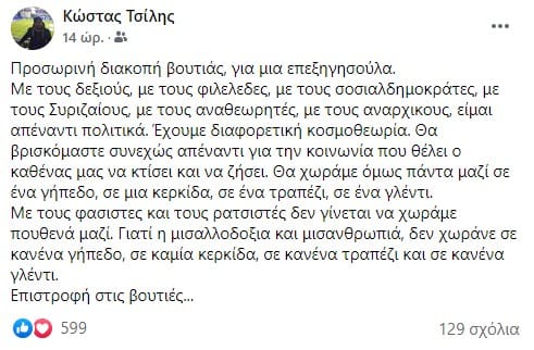 Και για μην λέτε ότι το πάω μονόπατα… Na και τι γράφει ο φίλος Γιάννης Σαντοριναίος στο δικό του προφίλ στο Facebook