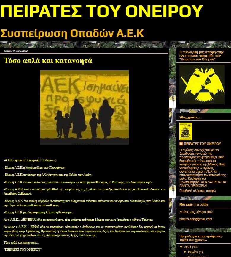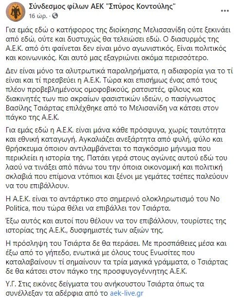 “Δηλώνουμε με εκκωφαντικό τρόπο και τόνο την αντίθεσή μας στην πρόσληψη αυτού του σκουπιδιού στην ΑΕΚ και το λέμε από τώρα με κάθε τρόπο ότι δεν είναι αποδεκτός αναμεσά μας. Γιατί ο τοίχος λέει: “ΑΕΚ ΣΗΜΑΙΝΕΙ ΠΡΟΣΦΥΓΙΑ ΞΕΡΙΖΩΜΕΝΗ”, γιατί ο Κοντούλης πέθανε για αυτά τα ιδανικά, γιατί το πούλμαν στο Βελιγράδι μπούκαρε για την ειρήνη, γιατί ο Τζούντα Γκαρσία και ο κάθε ποδοσφαιριστής μας όσο “διαφορετικός” κι αν είναι, δεν αποτελεί λαθροεισβολέα, όπως ο Τσάρτας πιστεύει, αλλά ίσο μέλος μας και όχι άτομο που θα του ζητούν πιστοποιητικό για να μπει στα Σπάτα, γιατί στην τελική και χωρίς διαπραγματεύσεις είναι διαφορετικό να είσαι ΑΕΚ….