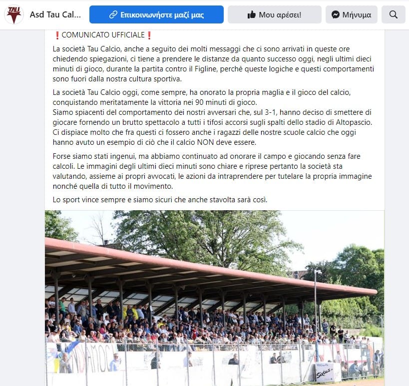 “Η Tau Calcio, μετά τα πολλά μηνύματα που έχουν έρθει τις ώρες ζητώντας εξηγήσεις, θέλει να αποστασιοποιηθεί από αυτό που συνέβη σήμερα, στο τελευταίο δεκάλεπτο του αγώνα με την Figline. Αυτές οι “λογικές” και συμπεριφορές είναι έξω από την αθλητική μας κουλτούρα.